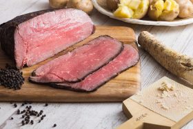 ・ジューシーに焼き上げたローストビーフ(北海道産山わさび/ガーリックソース/オニオンソース)