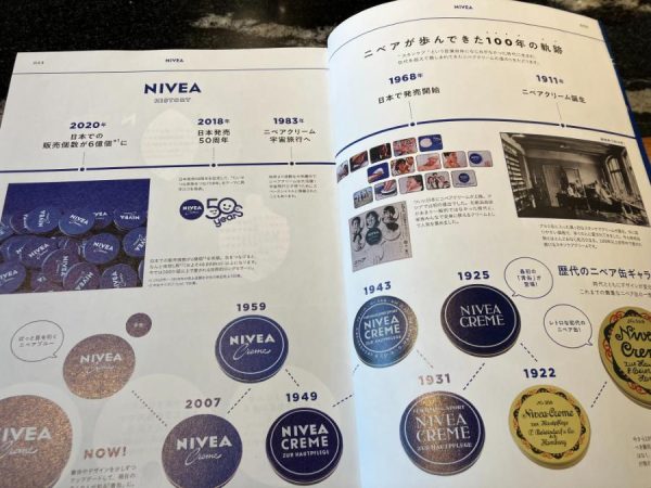 歴代のニベア缶ギャラリー、初代はレトロ可愛くて、確かに時代とともにデザインが変化していますが、発売してたった14年後の1925年には、もう最初の「青缶」デザインが登場していたのには驚きました。3世代で愛用しているご家族も多いニベアクリームですが、次世代に伝えていきたい名品だなと改めて感じました。