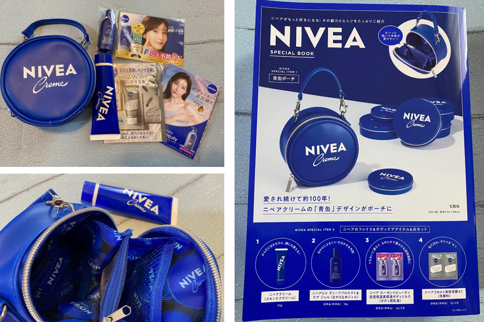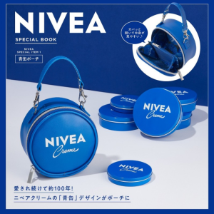 ニベア100年の歴史や特長がわかる読み物部分も大充実。付録(というかメイン!?)のNIVEA [ニベア]「青缶」デザインポーチは遊び心いっぱいのお品。フェイス&ボディケア アイテムもついています。