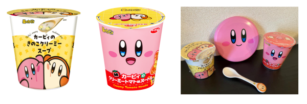 ※写真右中央のカービィフリスビーは、アラサーライターの私物です。【商品名】カービィのきのこクリーミースープ 【価格】200円(税込216円) 【発売日】2025年11月11日(火) 【発売地域】全国 ※数量限定 / 【商品名】星のカービィ クリーミートマト味ヌードル 【価格】228円(税込246円) 【発売日】2025年11月11日(火) 【発売地域】全国