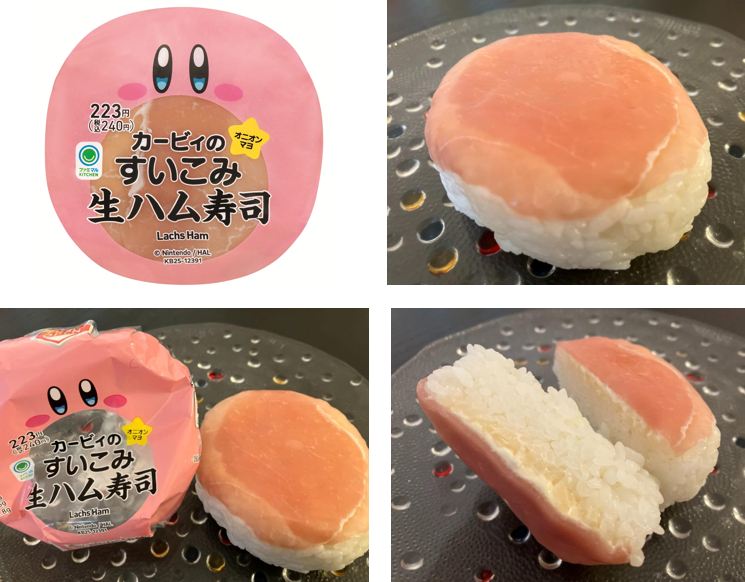 生ハムのピンクが美しく、カービィのパッケージとの相性と工夫が抜群で思わず笑顔に。ご覧のとおり酢飯が一粒一粒しっかりしていて、本格的で美味しい!お子様から大人まで大満足◎