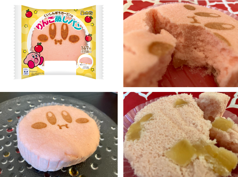 淡い色の焼き印カービィは食べるのがもったいない可愛さ。優しい色のふわっふわ蒸しパンに、存在感ある角切り林檎がアクセント。写真右下はひっくり返した画像ですが想像以上に「りんご」が入っていますよね!