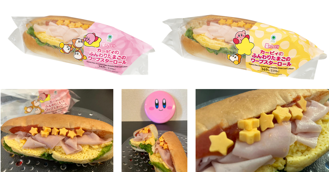 カービィの乗り物「ワープスター」をイメージ。ふんわり食感のオムレツとスクランブルエッグに、ハム、トマトのソース、グリーンリーフを合わせた彩りの良いロールパン。カービィの世界のワープスターをイメージした星型のチーズをトッピング。パッケージは2種類です。※数量限定