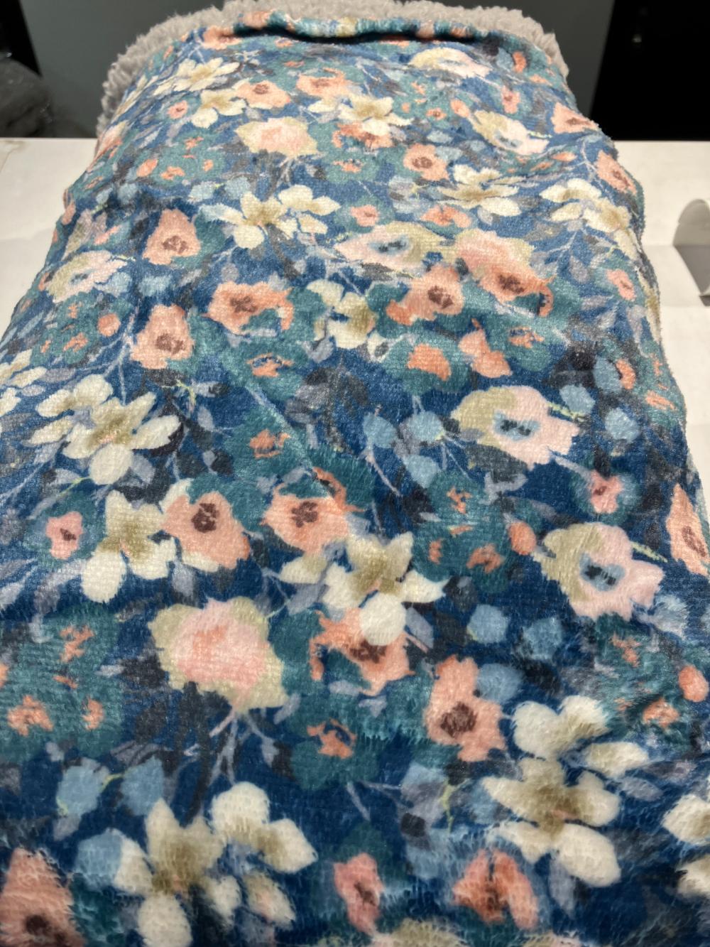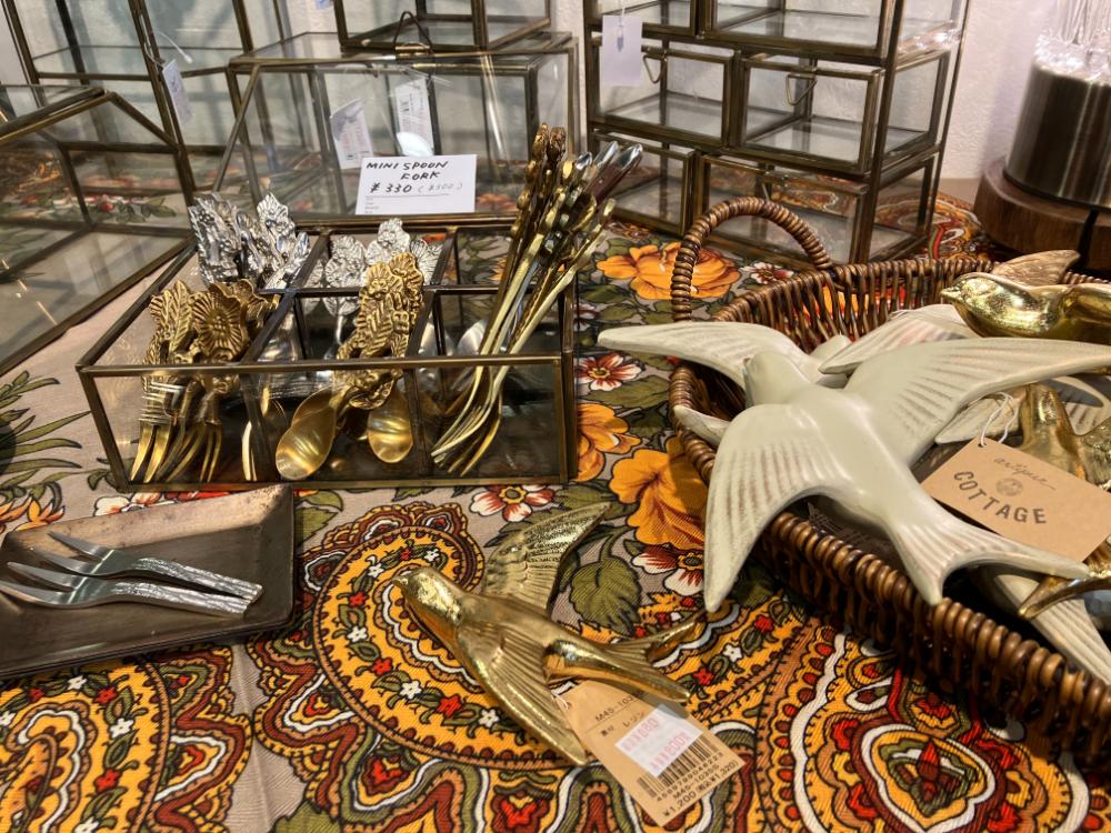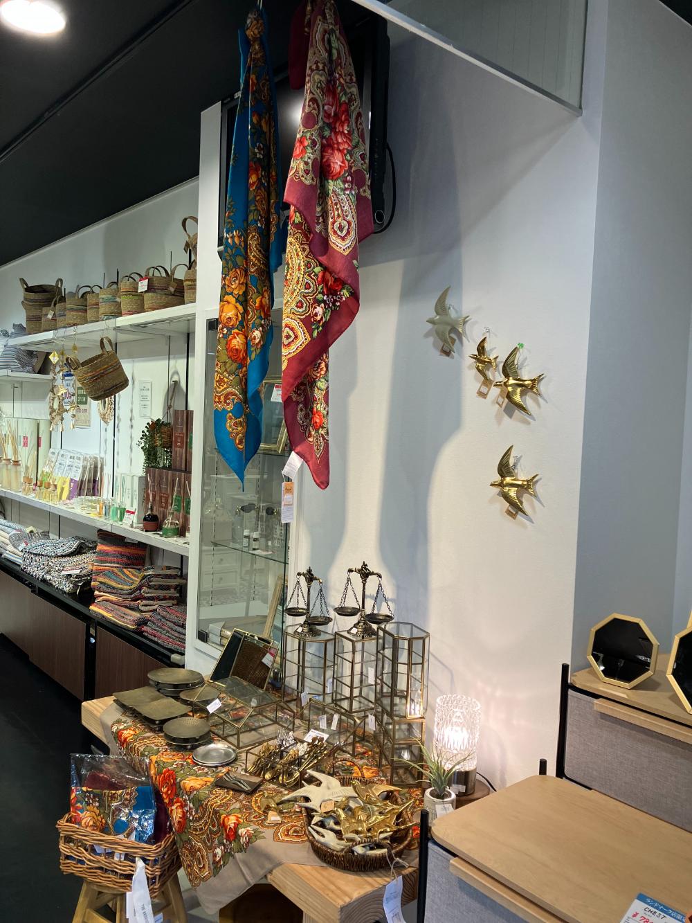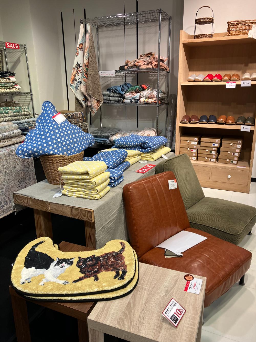 本記事でご紹介しているのは、雑貨中心のエリア。宝箱のようにキラキラわくわく輝くお品がいっぱい!この日はラスト1点だったシックな花柄のひざ掛け毛布を購入。猫ちゃんの毛布もありました。