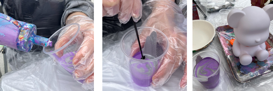 ただ、「勿体ない」が口癖の性格の筆者は、なるべく下に溜まった絵具を無駄なく使いたいと思い、🐻クマちゃんの後ろ姿への「追いマーブル」は用意されているスプーンですくって彩色しました。