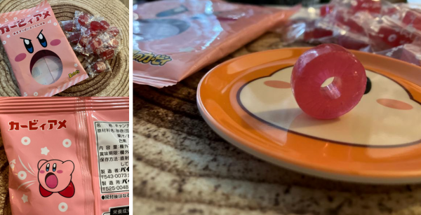 「輪切りのパイナップルをイメージした真ん中の穴がトレードマークのパイン飴🍍」とのコラボなので、ご覧の通りアメに穴が開いていて、それがドーナツやカービィの口みたいで楽しい!