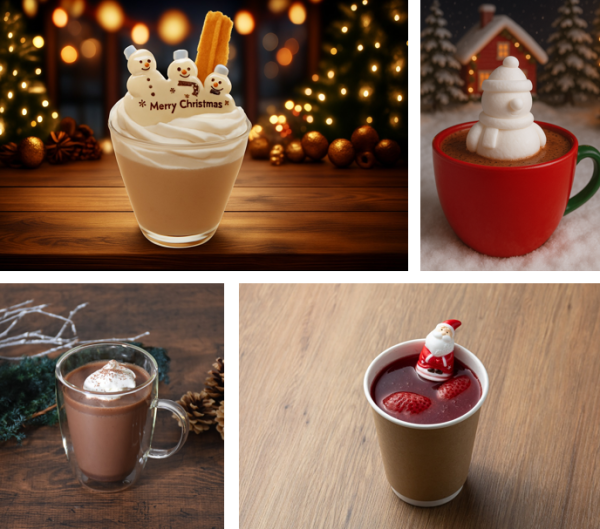 ふわふわの生クリームでかたどったサンタクロースや雪だるまが、あたたかいココアのお風呂に浸かっているような見た目は、思わず写真を撮りたくなる愛らしさ!濃厚なココアのコクと、とろける生クリームのやさしい甘さが広がる冬限定の特別なメニュー。