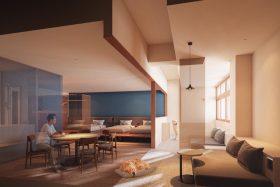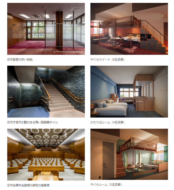全276室、広さ20㎡から73㎡の全9タイプを用意。客室のテーマカラーである赤・青・緑は、それぞれ旧市庁舎内で使用されていた色を落とし込んでいます。赤は旧市長室の絨毯の色、青は旧市庁舎内の艶のある磁器質タイルの色、緑は旧市会棟本会議場議員席の色をイメージしています。また、最大6名まで宿泊できる「やぐらスイート」は、広さと高さを兼ね備え、友人グループや家族で利用する際も同じ空間でゆったりと過ごせます。最大4名定員の「かたりばルーム」は、2名で広々と贅沢に過ごすのも良し、4名でソファを囲み、語らいながら楽しむのもおすすめです。そのほか部屋タイプの異なる個性豊かな客室を用意し、旅のシチュエーションごとに選ぶことができます。