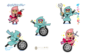 GS業務や車検、タイヤ交換や整備を得意とする小さな忍者たち。安心安全に車に乗って頂けるよう、日夜 車のメンテナンスを一生懸命頑張っている、けなげな妖精です。