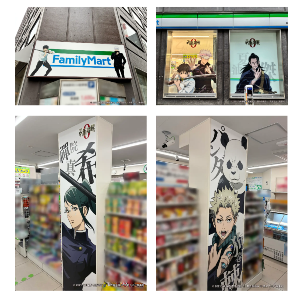 ファミマ×『呪術廻戦』コラボキャンペーン【第一弾】は『劇場版 呪術廻戦0』復活上映で銀座に乙骨憂太たちが集結!劇中の世界観に特別ラッピングされた店舗が登場。店舗外観には乙骨憂太、夏油傑、五条悟が描かれ、店内にも他人気キャラクターが各所に装飾されています。
