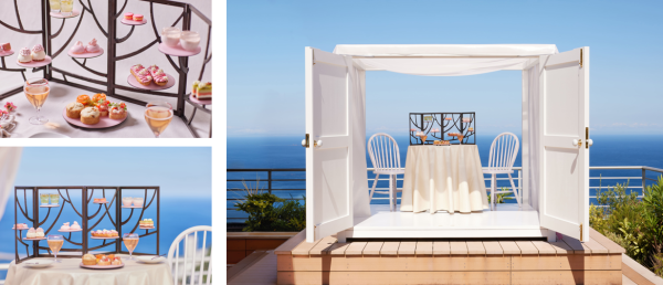 テラス席には、春の訪れを感じられる特等席が登場。白い扉を開けると、そこには淡いピンク色のドレープカーテンに包まれ、華やかに設えられた空間が広がります。目の前の海と街並みを眼下に、アフタヌーンティーを味わいながら少し早い春を感じ、贅沢なひとときを心ゆくまで過ごせます。