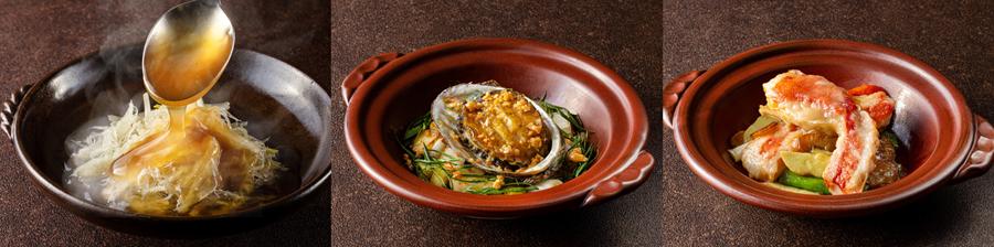 「海鮮饗宴 冬の土鍋コース」では、海のコラーゲンと白湯スープを丁寧に陶板で煮込み、濃厚なダシとまろやかな風味が際立つ一皿や、コクと柔らかな食感が魅力の山口県産黒鮑の蒸し焼き、葱と生姜の香りが立ち上るタラバ蟹の土鍋炒めなど、冬ならではの逸品が揃います。
