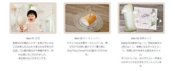 ① ご自宅でも記念日のお祝い「思い出づくり」ができる記念撮影セット