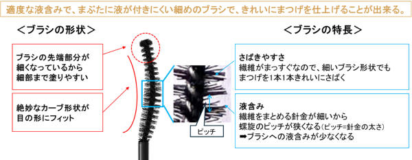 また、塗布具には「ムーンスリムブラシ」を採用し、毛のさばきやすさや液含みのちょうどよさ、まぶたへの付きにくさにもこだわりました。ふんわり軽い使用感の中味液との相性がよく、繊維フリーでも上品な美ロングまつ毛に仕上がります。