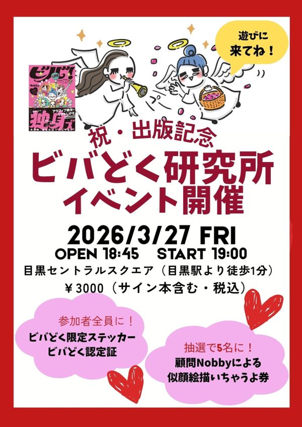 本書の発売を記念し、「ビバ!独身研究所」がリアルイベントとして登場! 著者のNobby氏と、所長(担当編集)のアサミが登壇し、マンガには描ききれなかった裏話や、シングルライフを思い切り楽しむための「ビバどく的」マインドセットを語り尽くします。独身の方はもちろん、人生の選択にモヤモヤしているすべての方のご参加をお待ちしております!