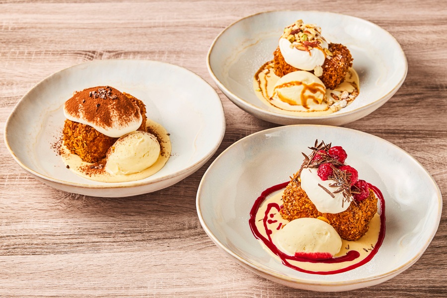 バター香るブリオッシュ生地をあえて“揚げる”ことで、外はカリッと、中はとろとろに仕上げた新食感のフレンチトースト。個性豊かな4種類のフレーバーをご用意しました。揚げたてのフレンチトーストに添えられたバニラアイスがとろりと溶け出し、濃厚なソースのように絡み合います。
